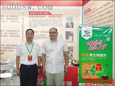 中國農(nóng)業(yè)技術(shù)推廣協(xié)會會長陳生斗先生(左)與百花生物馬欽波經(jīng)理(右)