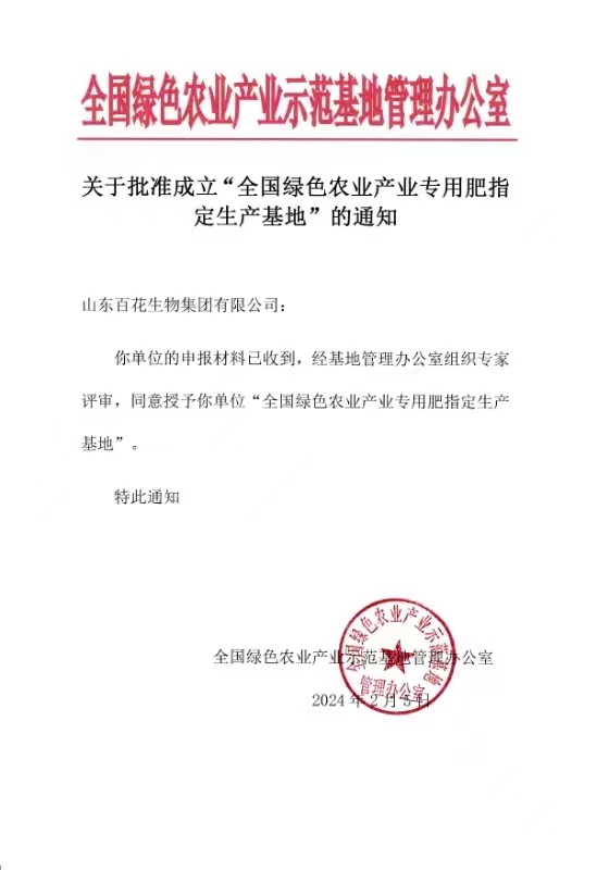 2024年2月5日,山東百花生物集團(tuán)有限公司,榮獲“全國(guó)綠色農(nóng)業(yè)產(chǎn)業(yè)專用肥指定生產(chǎn)基地”殊榮。